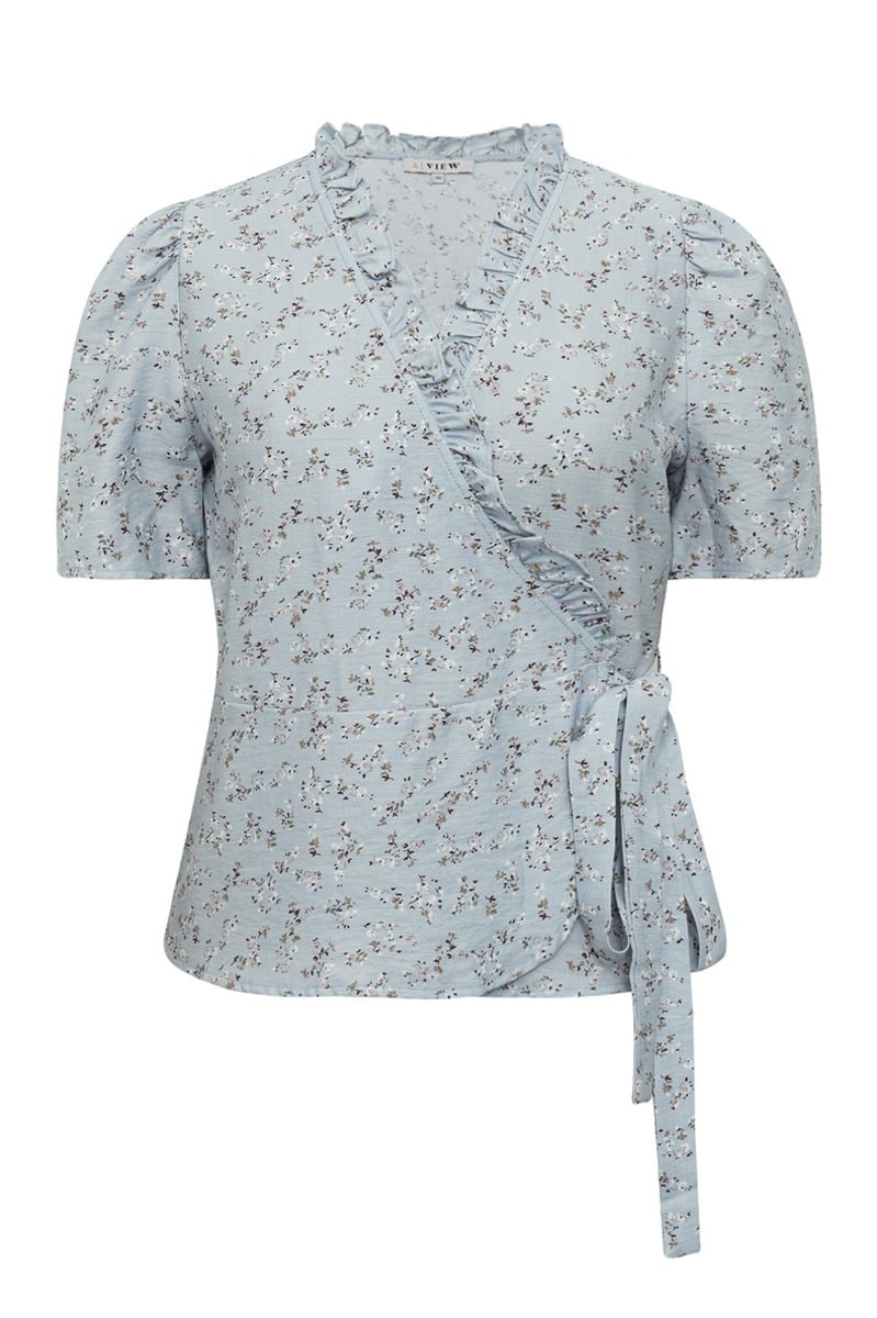 Super sød slå-om-bluse fra A-view. Blusen er i et flot lyseblåt print med mange finde detaljer. Du kan også finde denne style som env kjole på shoppen.Â