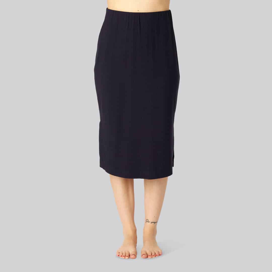Blød og alsidig bambus nederdel med rib i navy blå Få en elegant og komfortabel bambus nederdel med flot ribbede struktur i den klassiske navy farve. Denne midi-lange nederdel kombinerer et tidløst design med moderne detaljer, hvilket gør den til et uundv