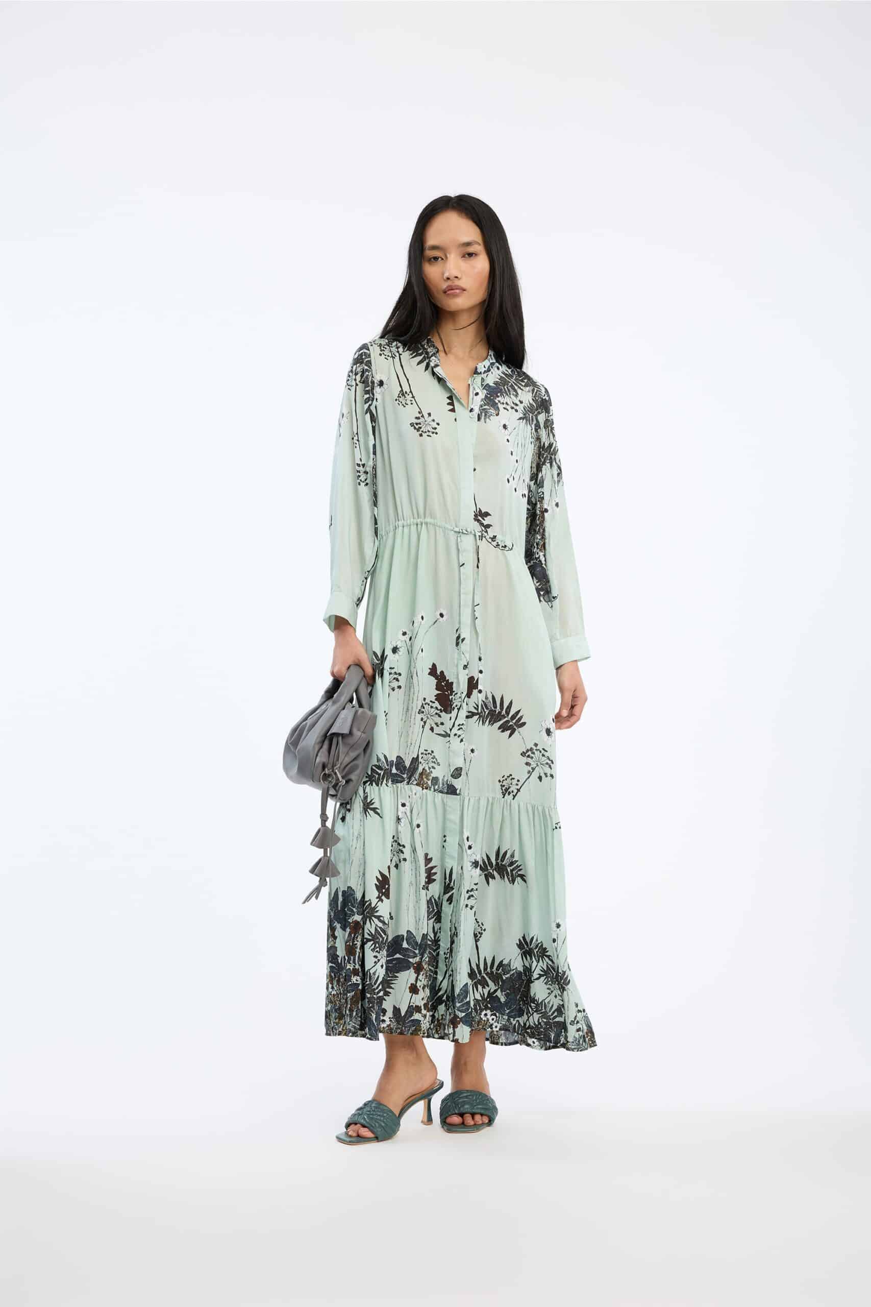 Elegant lang kjole i en let og luftig kvalitet med et botanisk print. Kjolen har lange ærmer med manchetter, en diskret stolpelukning foran og en justerbar snøre i taljen, der giver mulighed for at tilpasse pasformen.