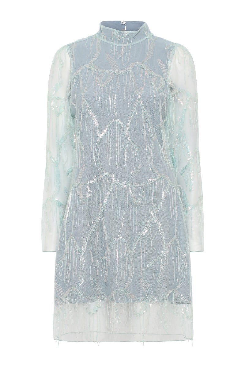 Dette er den smukkeste kjole vi længe har set. Den er i denne kyseblå farve i to lag, hvor den yderste er en mesh kvalitet og den inderste er med til at den ikke bliver gennemsigtig. Den lukkes i nakken med knapper og har denne tætsiddende model. Den er f