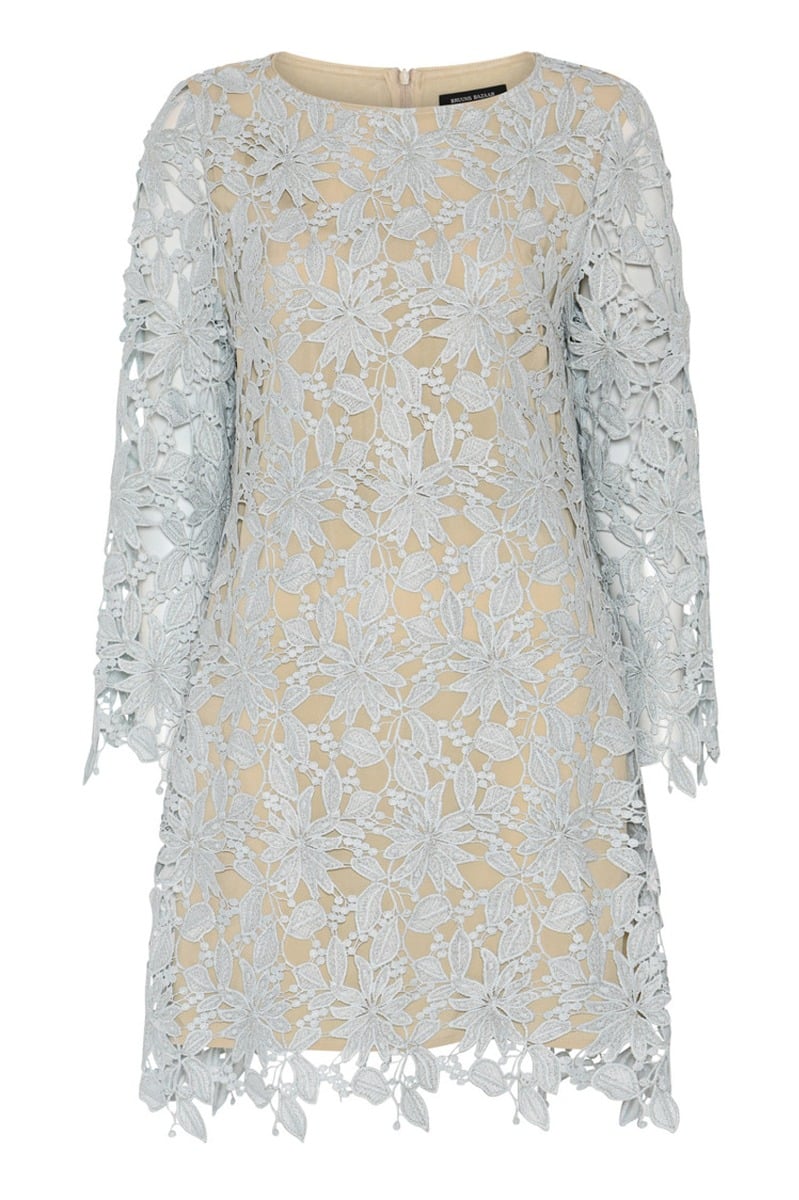 Denne lyseblå blondekjole er et feminint og eksklusivt valg, der kombinerer romantiske detaljer med et enkelt, elegant snit. Det smukke blomstrede blondemønster skaber et let og luksuriøst udtryk, mens den nude underkjole giver en flot kontrast og fremhæv