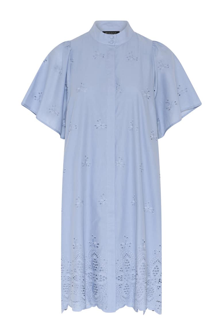 Den fineste kjole fra Bruuns Bazaar. Denne kjole har korte ærmer, fine broderede blomster og en fin knap detlaje ved halsen. Den er i en smuk lyseblå farve som er perfekt her til foråret, den kan både styles til hverdag og til festlige begivenheder med en