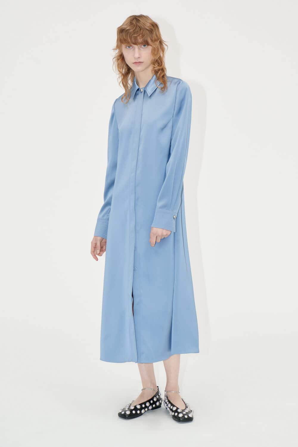 Klassisk skjortekjole fra Stine Goya med lange ærmer og en klassisk krave. Kjolen har en midi længde og er fremstillet i et blødt satinlignende materiale.