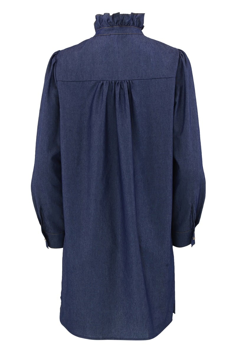 Denne kjole er lavet i mørkeblå denim og har et feminint, klassisk snit med fine detaljer. Den har en høj flæsekrave og en kort knaplukning foran med små, dekorative knapper. Langs knapstolpen løber en markant flæse, som giver kjolen et elegant og romanti