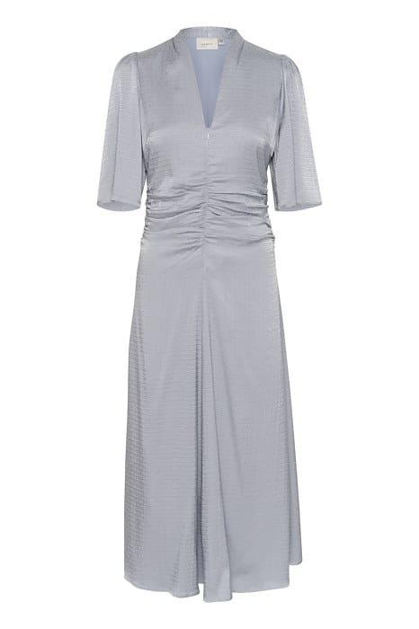 En virkelig smuk og elegant kjole fra Gestuz er landet. Denne kjole er i den fineste støvede blå farve, med 3/4 ærmer og V-udskæring. Kjolen sidder lidt tættere i livet, hvilket giver en flot feminin silhuet.