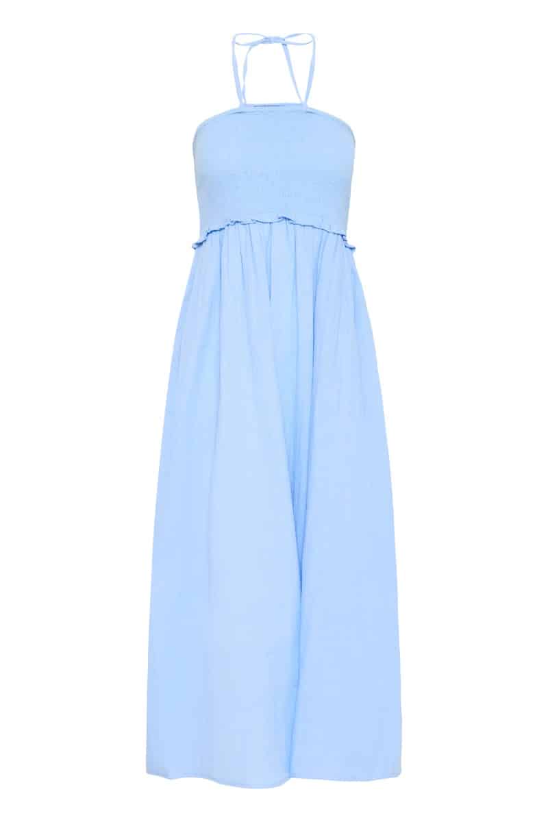 Lyseblå top med smockdet overdel, som giver en fleksibel og komfortabel pasform. De tynde bindestropper bindes i nakken og skaber et let, feminint udtryk, mens den lille flæsekant under brystet giver en blød overgang til den luftige underdel. Enkel og som