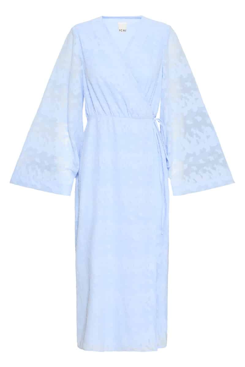 En smuk slå-om kjole i den skønneste lyseblå farve fra Ichi. Den er bred i ærmerne som er lavet i den fineste blond kvalitet. Den er også ammevenlig pga slå-om effekt. Derudover sidder den tæt i taljen men ellers er løs, derfor får man også en fin figur i