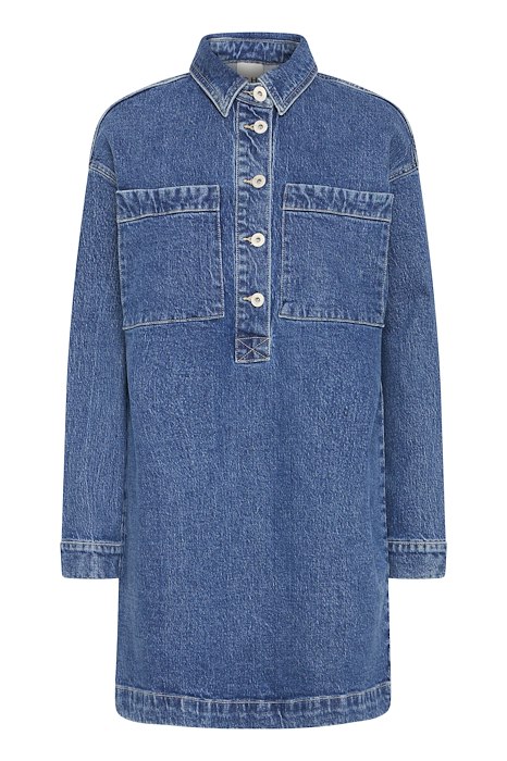 Sej kjole fra Ichi. Denne kjole har et cool snit, som falder pænt langs kroppen. Den har lange ærmer, krave og knaplukning. En kjole der er super nem at style til diverse anledninger, samt hverdag.