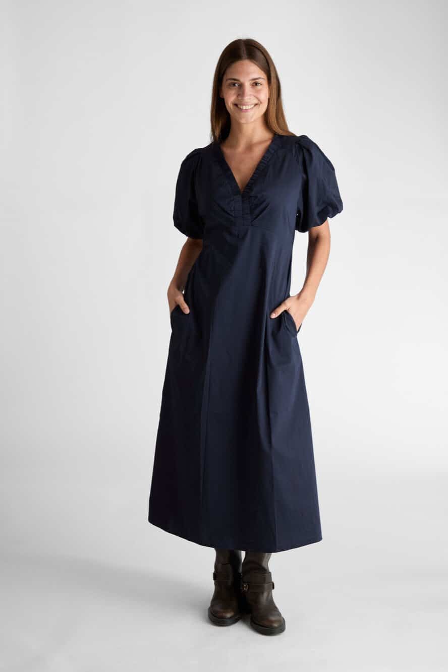 Illana Poplin kjolen er designet i en a-shape silhuet med v-udskæring, korte puffede ærmer og et langt a-skørt. Kjolen har lommer i siderne og rynker foran.