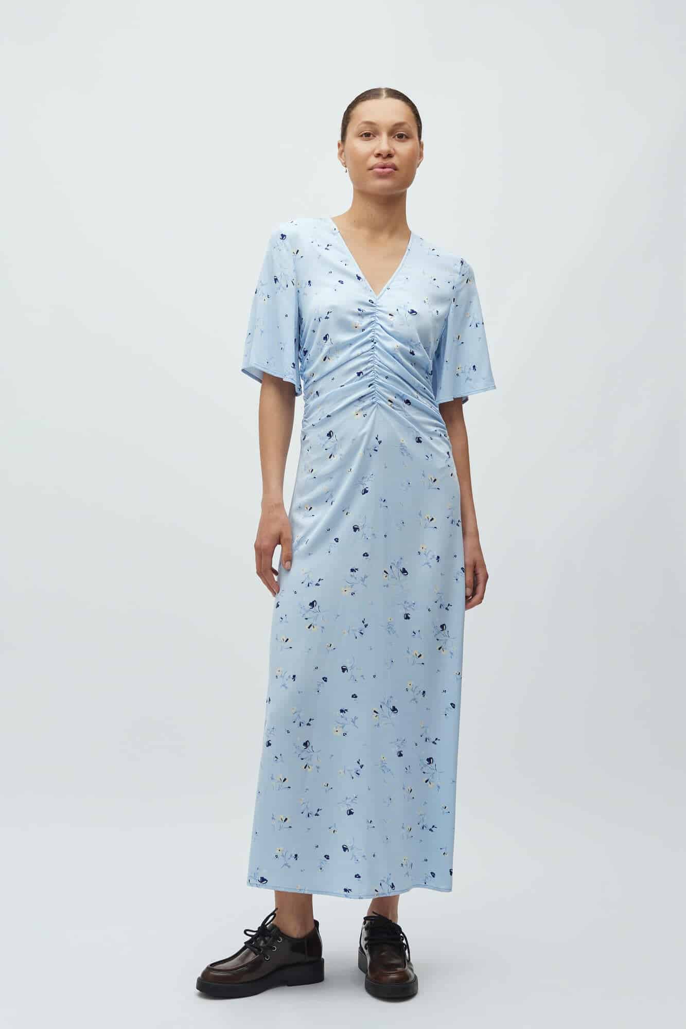 Denne elegante kjole fra MbyM er designet med et lyseblåt blomsterprint. Kjolen har korte ærmer, V-udskæring og rynkedetalje foran.