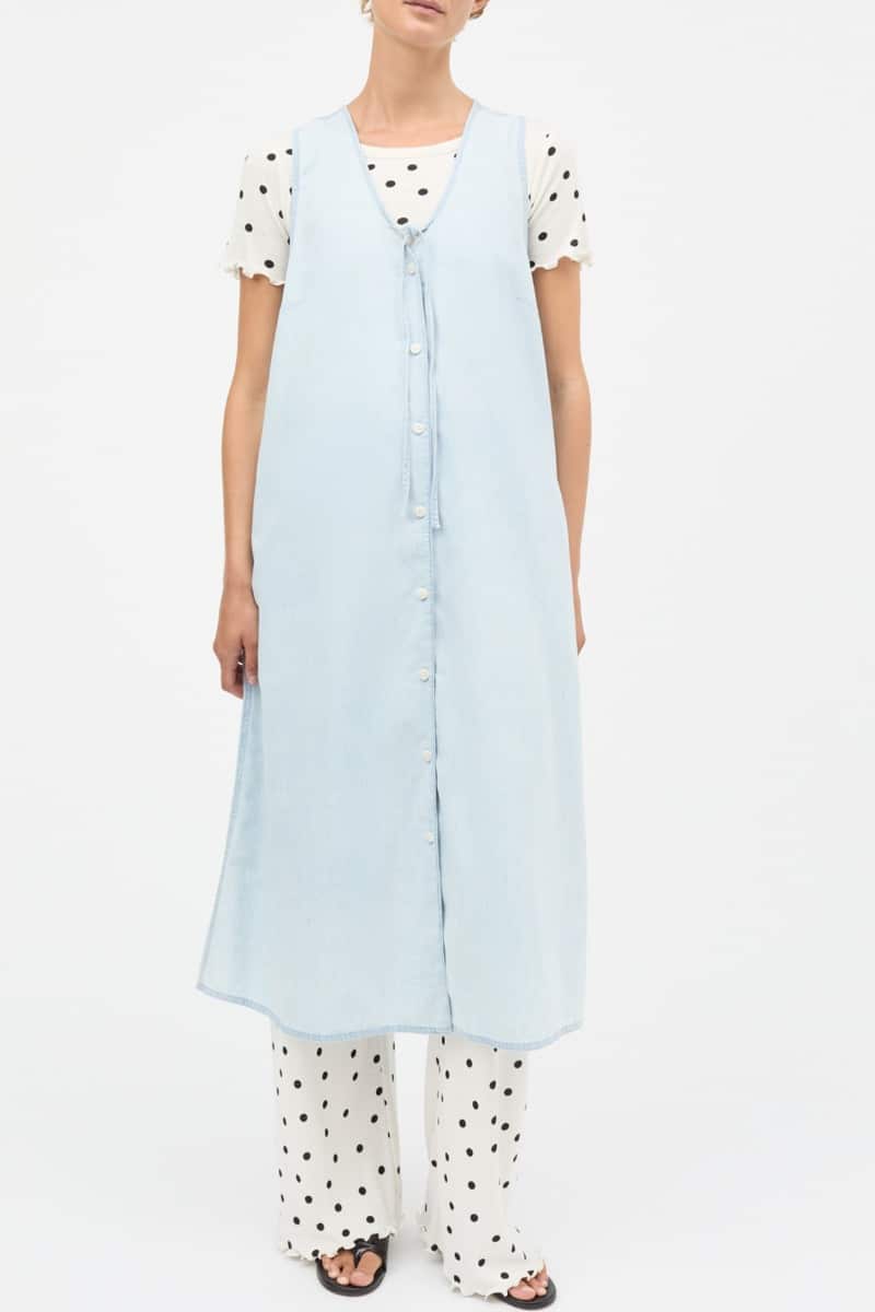 En virkelig fin og sød kjole er landet fra Mads Nørgaard i denne lette denim kvalitet. Kjolen har knapper hele vejen ned og et fint lille bindebånd ved halsen, som en flot detalje. Brug den til sommer til et par sandaler, eller smid en skjorte under til k