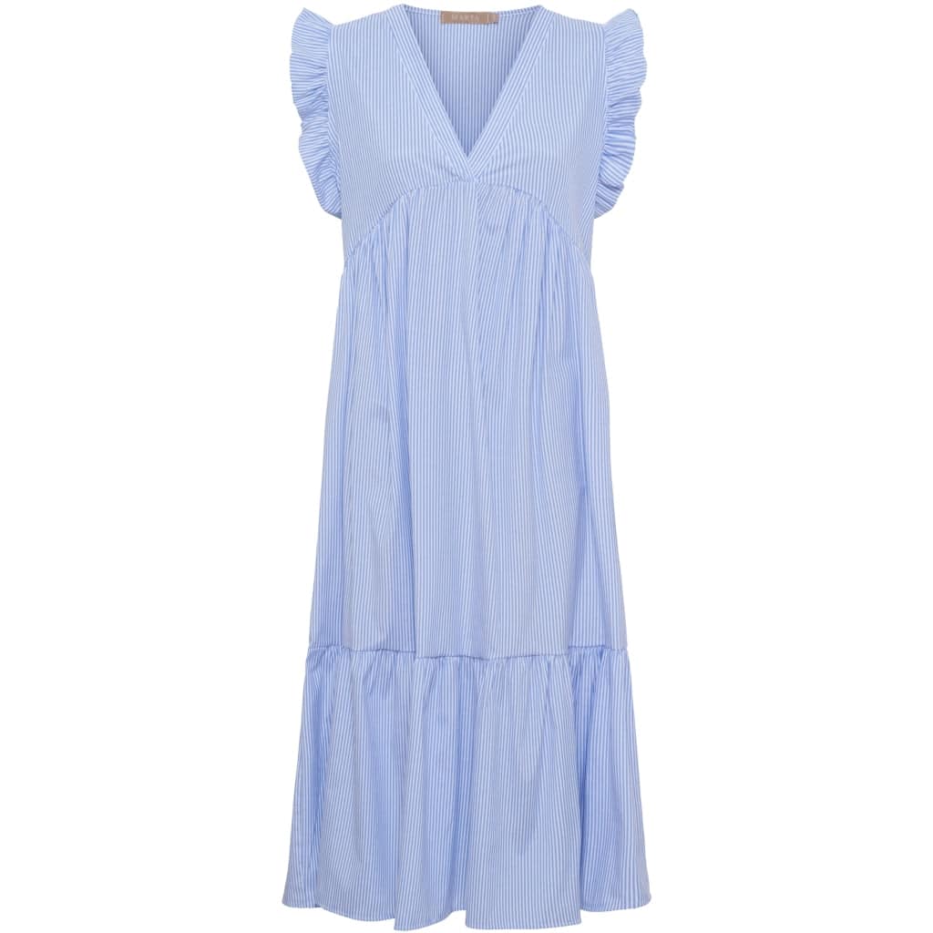Lækker luftig kjole fra Marta Du Chateau. Kjolen har kort ærmer og flæser.- Striber- V-hals- LuftigMateriale: 55% Polyester, 42% Bomuld, 3% ElastanSize S/MBrystmål: 52 cm.Længde: 115 cm.Size L/XLBrystmål: 54 cm.Længde: 117 cm.