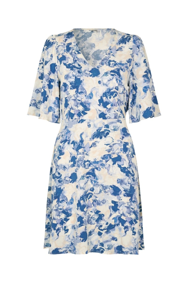 Kjole fra MbyM. Denne kjole har en afslappet pasform, store ærmer, v-hals og et let materiale. Den har fine farver og går til midt på låret. En super sød kjole både til hverdagsbrug og forårets/sommerens festlige begivenheder.