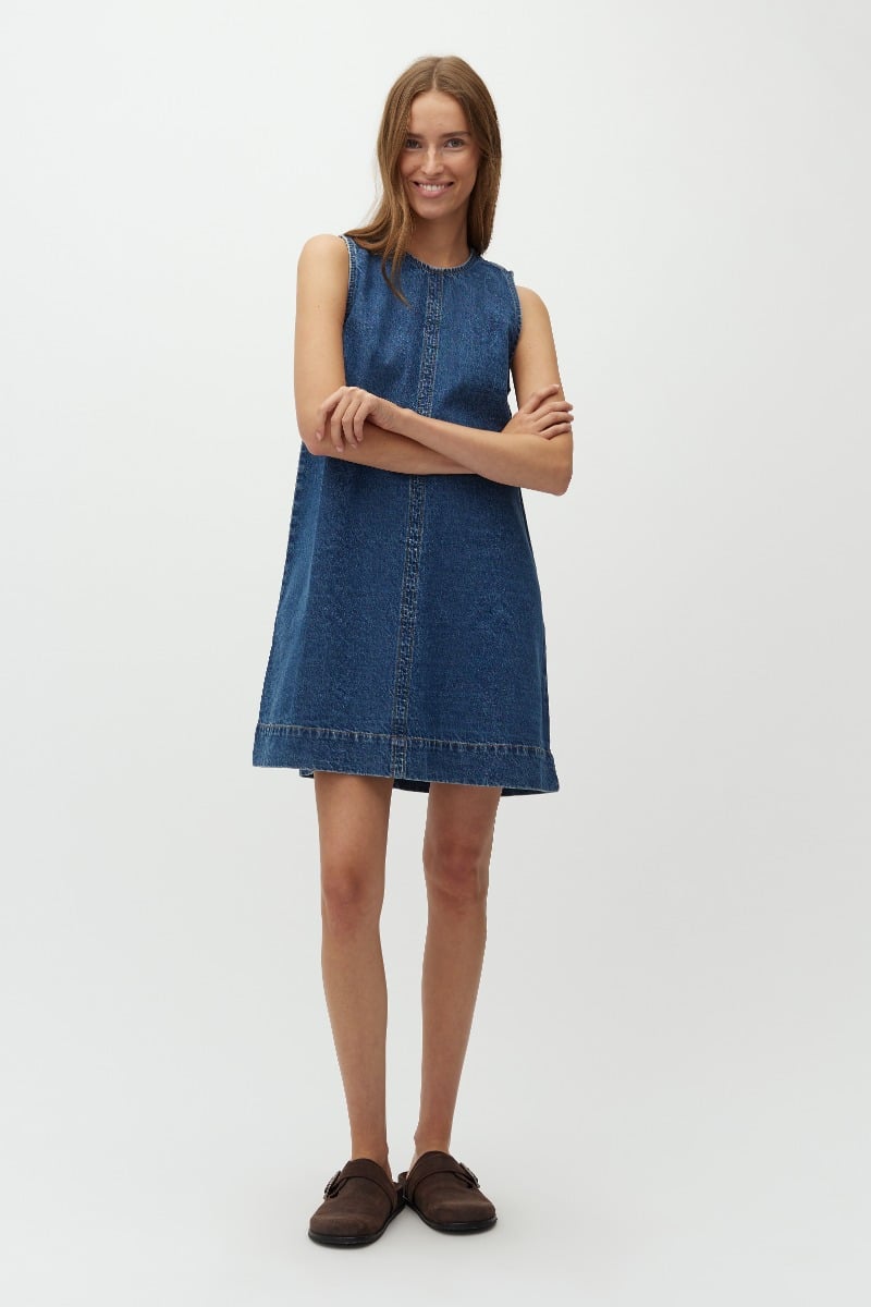 Denimkjolen har et enkelt og moderne look med et klassisk blåt jeansmateriale, der giver et afslappet, men stilrent udtryk. Den er ærmeløs med rund hals og en let A-formet pasform, som falder pænt og behageligt omkring kroppen. De synlige stikninger og de