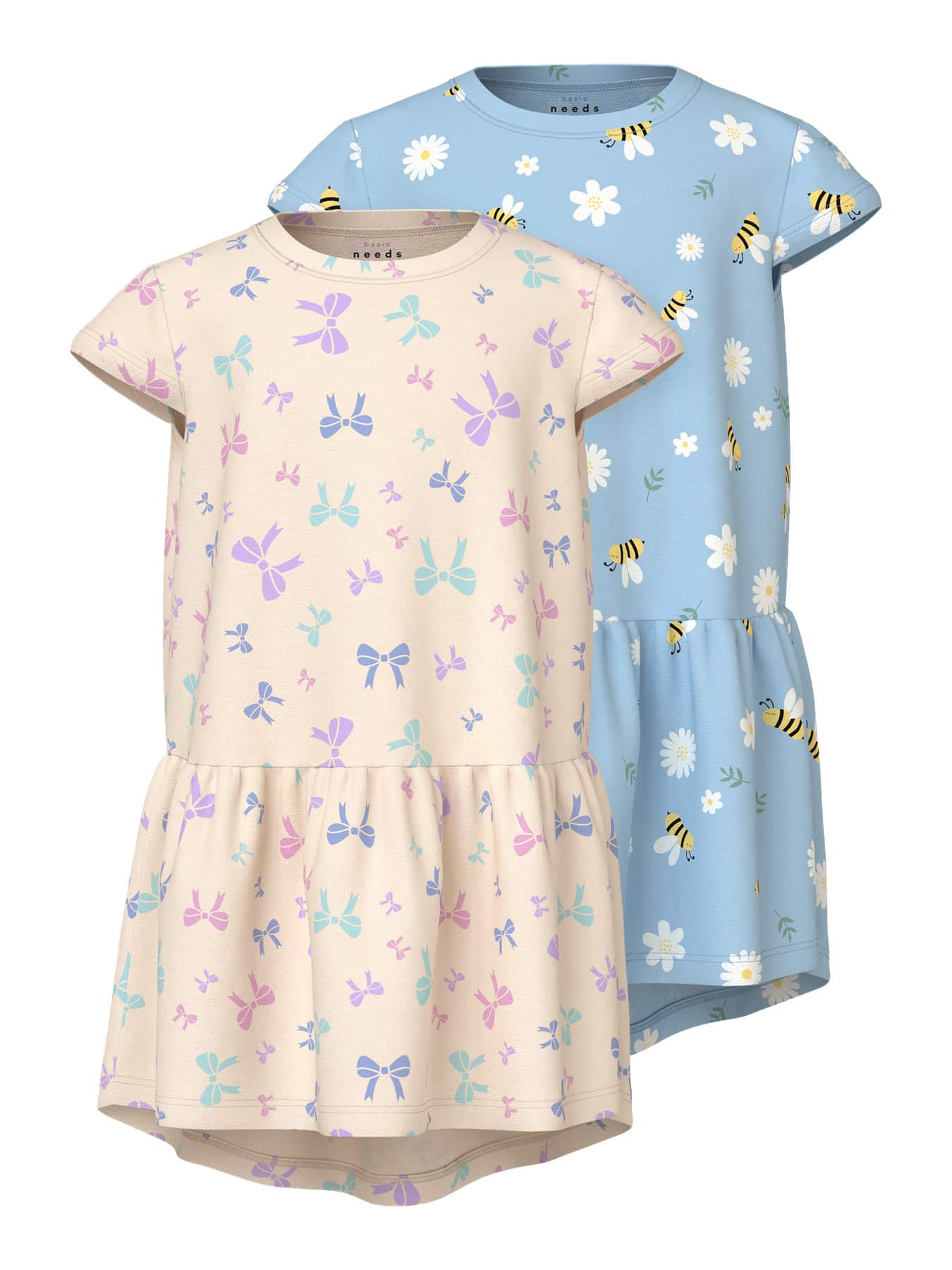 I denne pakke får du 2 flotte kortærmede kjoler fra Name It. Den rosa er med print af sløjfer, og den blå er med print af bier og blomster.