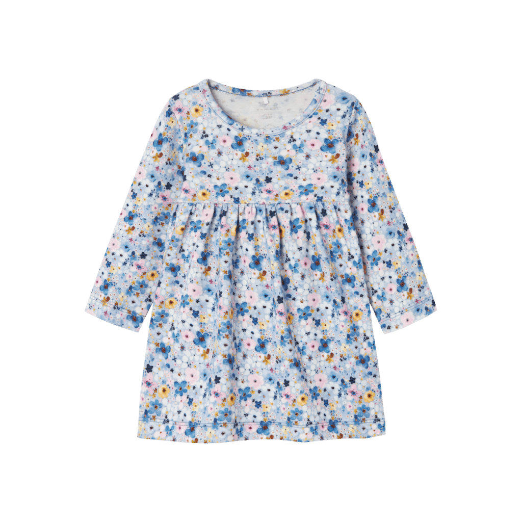 Smukkeste lille baby kjole fra Name it med lange ærmer. Kjolen er i mega blød kvalitet og med det flotteste blomster print i forskellige farver.