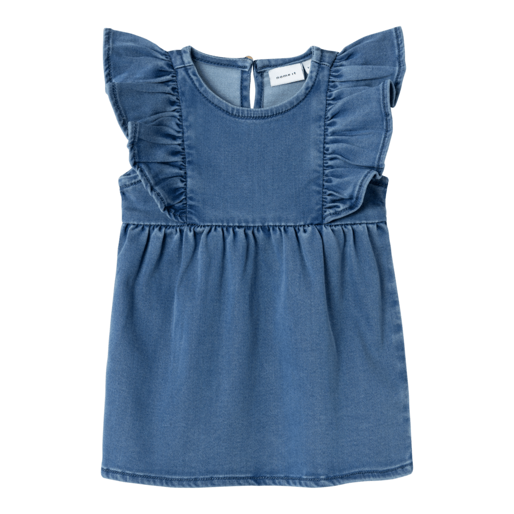 Super sød denim kjole fra name it. Den er med korte ærmer og har søde flæsekanter der går henover skuldrene. Den er lavet i en blød og lækker denim kvalitet og er i en pæn blå farve. Den er rund i halsen og så har den tre knapper bagpå der kan åbnes og lu