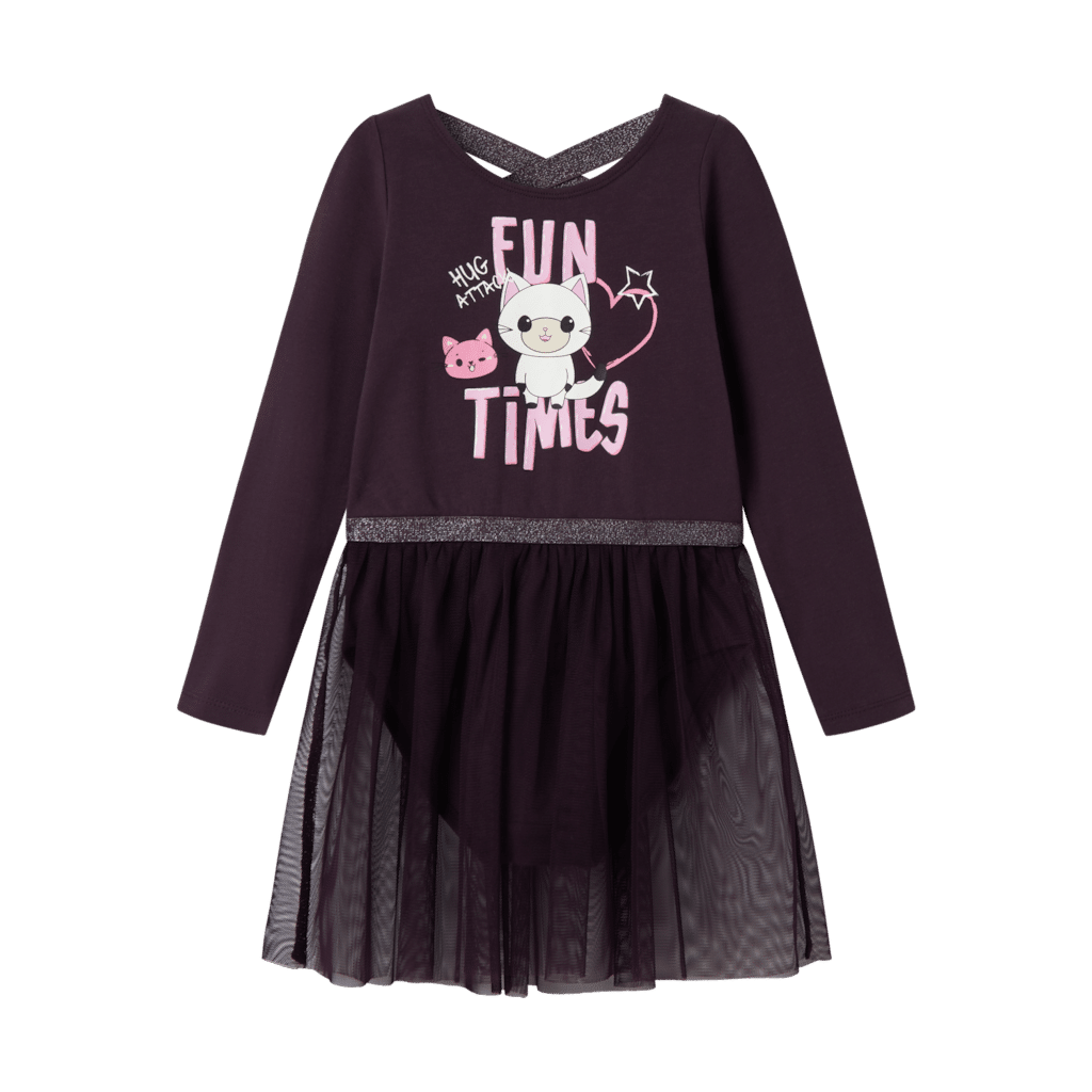 Der er en fin krydsning i nakken, som giver en ekstra detalje. Gymnastikdragten har et sødt tylskørt.