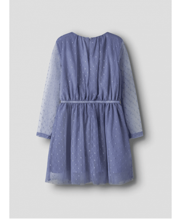 Tilføj elegance og komfort til dit barns garderobe med denne Name It kjole i blå til piger. Kjolen er lavet af lett tulle-stof i 100% polyester med en netstruktur, som giver et smukt og luftigt look. Den har rund hals, lange ærmer, elastisk talje og