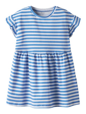 Yndig kjole fra Name it ed små flæse ærmer. Kjolen har flotte striber, rund halsåbning og er dejlig blød.