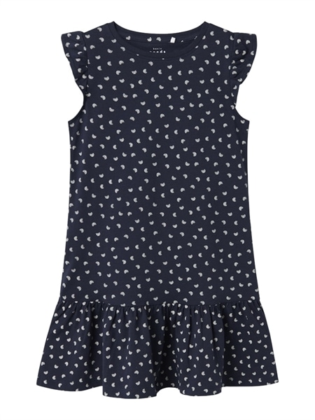 Super sød kortærmet kjole fra Name it. Kjolen er med flæse ærmer og skørt i bunden. Den er med det fineste print af muslingeskaller.
