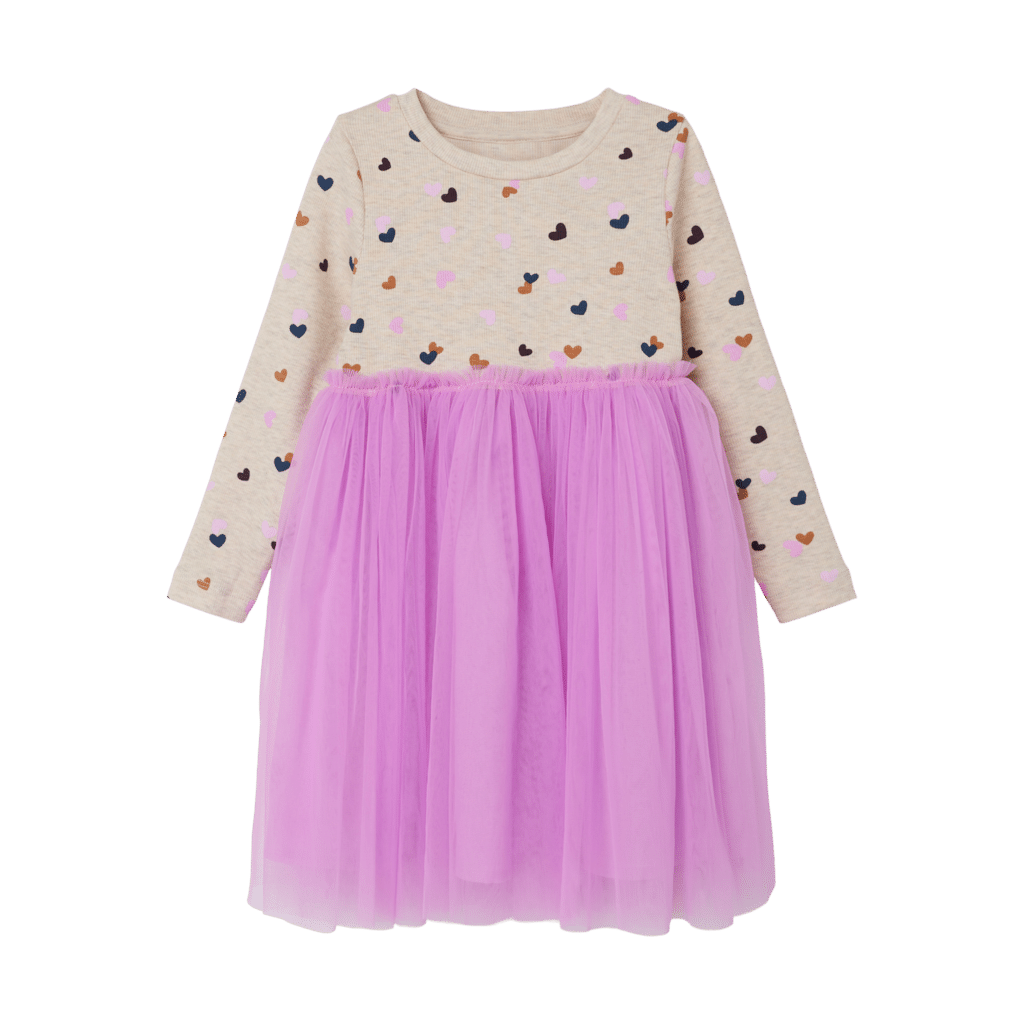 Super sød tyl kjole fra name it. Den er med lange ærmer, er rund i halsen og er lavet i den blødeste og lækreste ribbet kvalitet ved overdelen og et fint tyl skørt som underdel. Overdelen af kjolen er i en fed farve og med det sødeste print af små hjerter