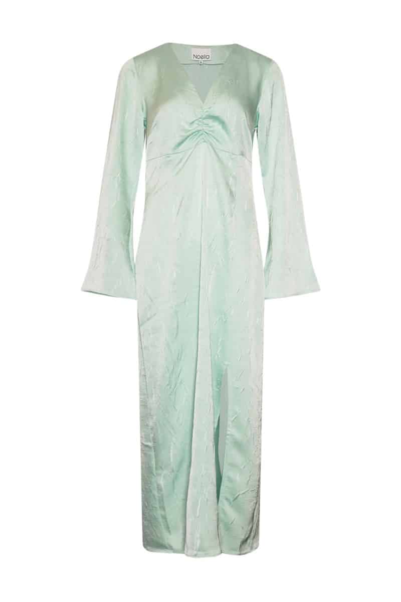 Kjole fra Noella. Denne kjole har et virkelig smukt design! Kjolen har en flot blå farvenuance, v-udskæring, slids foran og de flotteste ærmer. Kjolen sidder super flot og falder altså bare så pænt langs kroppen.