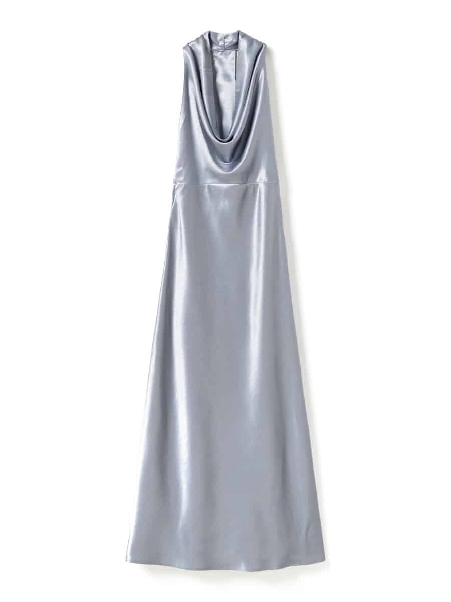 Denne smukke kjole i en sart lyseblå tone er fremstillet i et glansfuldt satinstof, der falder elegant og skaber et luksuriøst udtryk. Det draperede halsdesign giver kjolen et sofistikeret touch og fremhæver de bløde linjer. Den A-formede silhuet sikrer e