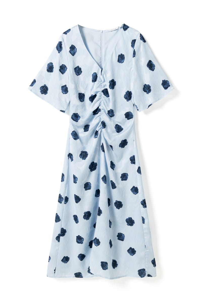 Den lyseblå kjole har et feminint og let udtryk med et blødt, glat stof, der falder flot ned langs kroppen. Den er dekoreret med mørkeblå blomsterprint, som giver et elegant og iøjnefaldende mønster. Kjolen har korte, løse ærmer og en V-udskæring, der ska