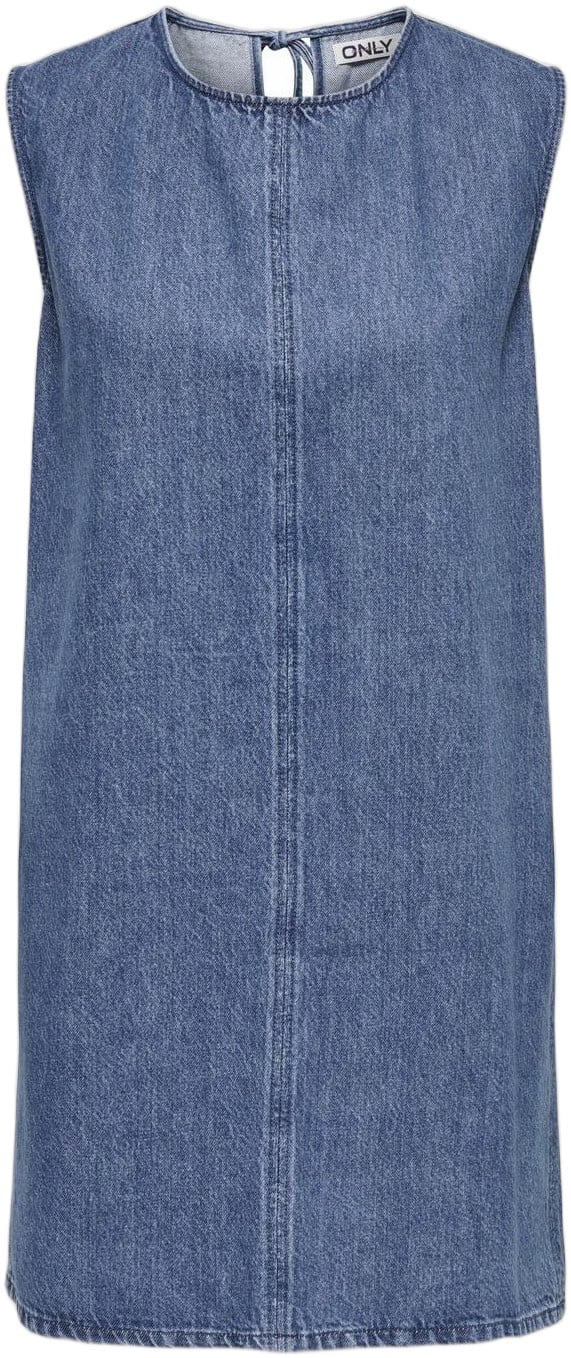 Keep cool med en denimkjole perfekt til et par sneakers og en let jakke om sommeren eller med strømpebukser, støvler og en strik for et enkelt vinterlook. – Produkttype : Denimkjole – Hals : O-hals – Ærme : Ærmeløs – Detaljer : Åben ryg, Stikningsdetaljer