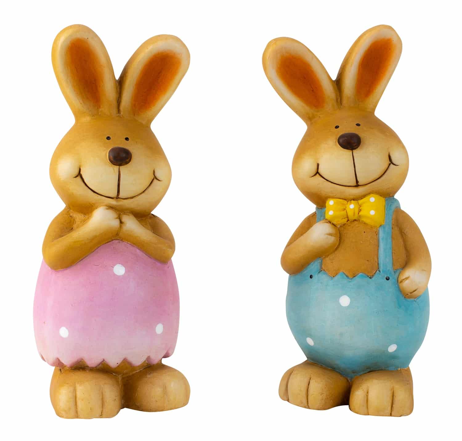 Påskehare med stort smil og hvidprikket tøj, der i facon leder tankerne hen på et æg. Påskeharerne findes i 2 varianter enten med lysrød kjole eller med blå bukser. Påskeharen måler 23,5 cm i højden. Fremstillet i keramik.Pakket med 1 stk.