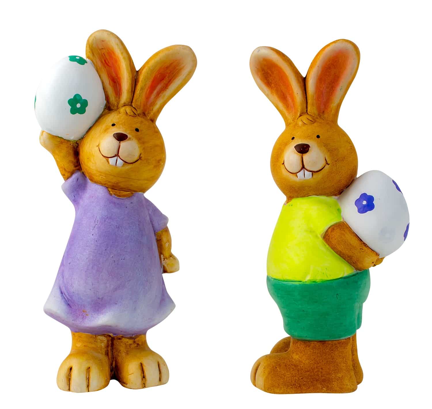 Påskehare med æg. Påskehare med æg findes i 2 varianter enten som påskeharepige med lilla kjole og æg med grønne blomster på eller som påskeharedreng med gul bluse, grønne bukser og æg med blå blomster på. Påskeharerne måler 20 cm i højden.Pakket med 1 st