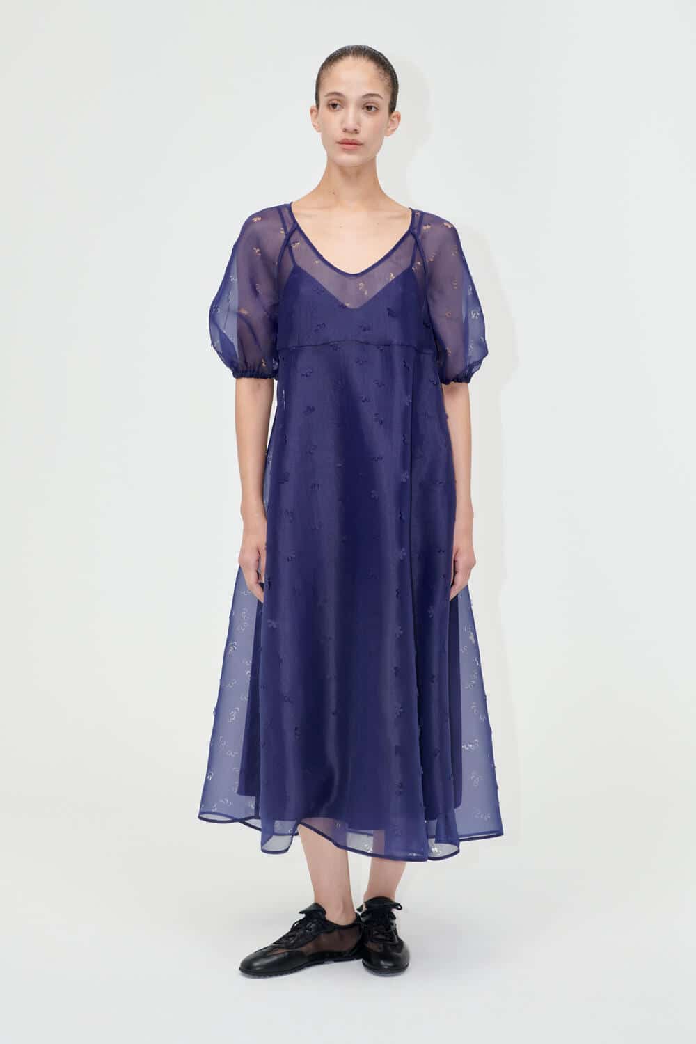 Denne vare udgår af sortiment og sælges til udsolgt. Puff Sleeve kjolen fra Stine Goya er en elegant og luftig kjole i en dyb navyblå nuance. Kjolen er designet i transparent materiale med blomsterdetaljer. Den har korte, let puffede ærmer og en flatteren