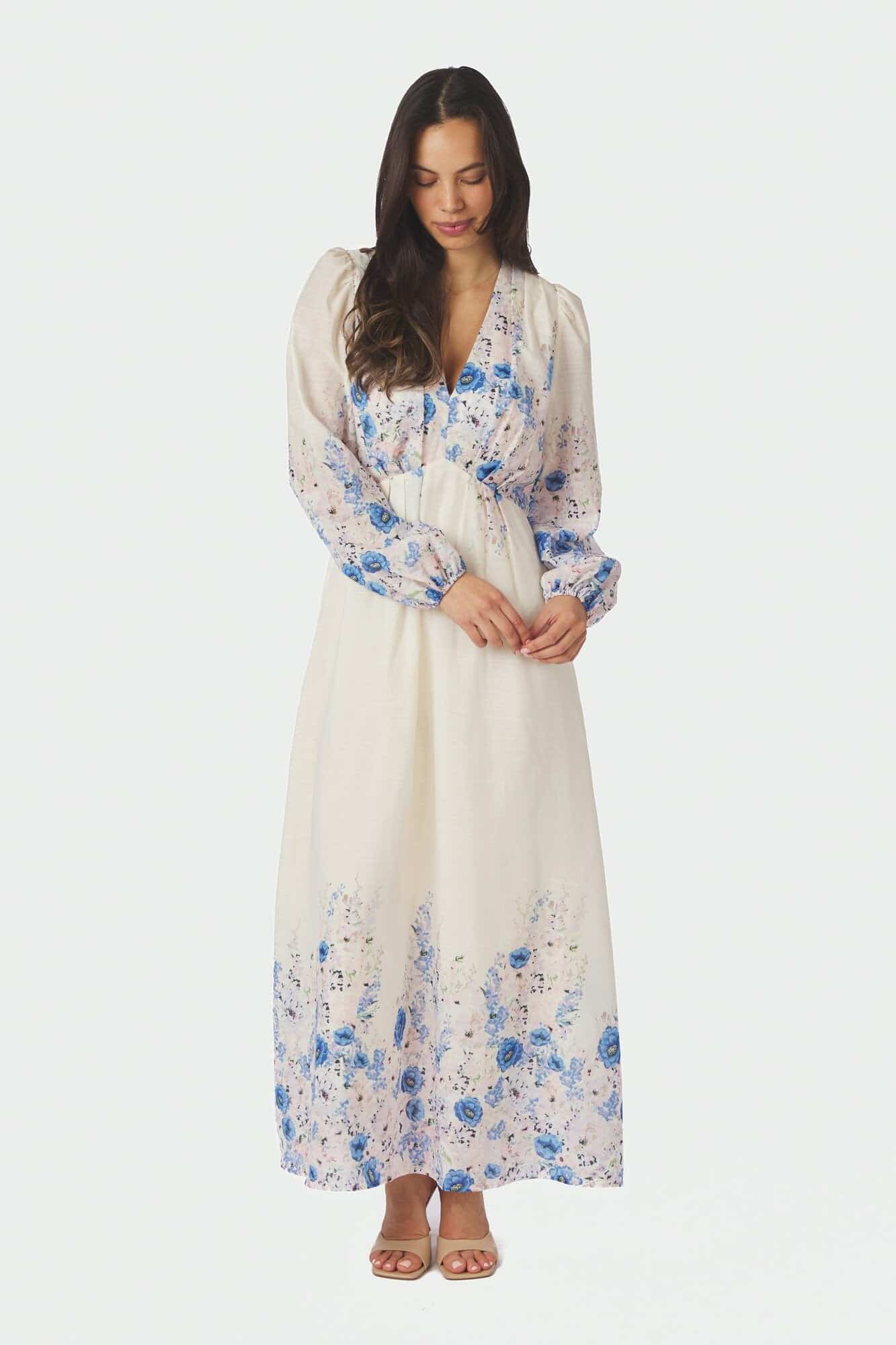Lang kjole i en lys cremefarve med blomsterprint i blå og pastelfarvede nuancer. Modellen har en dyb V-udskæring og en let markeret talje, der giver en feminin silhuet. Kjolen er designet med lange ærmer med let volumen og elastiske manchetter.