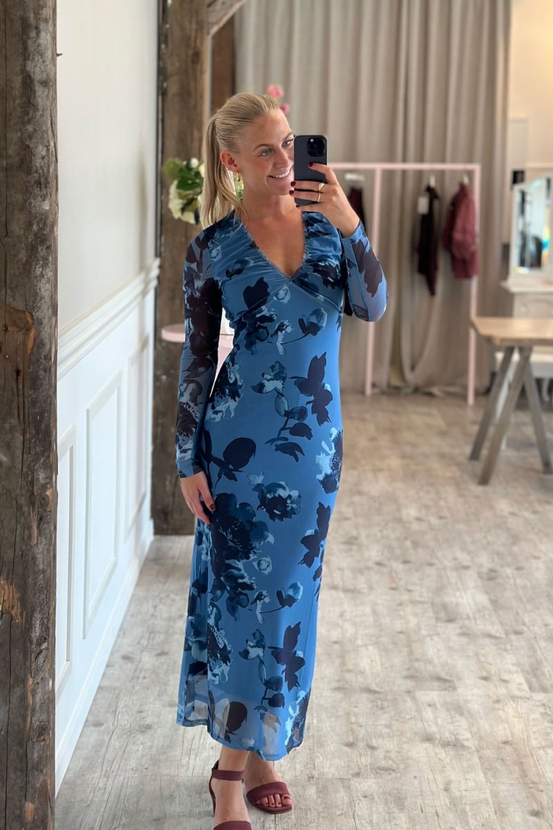 En fin kjole i en skøn mesh kvalitet i blåt mønster fra Sisters Point er landet til denne sæson. Den er med V hals og har lange ærmer. Den er foret og derfor ikke gennemsigtig. Perfekt til fest med en stilet.Â