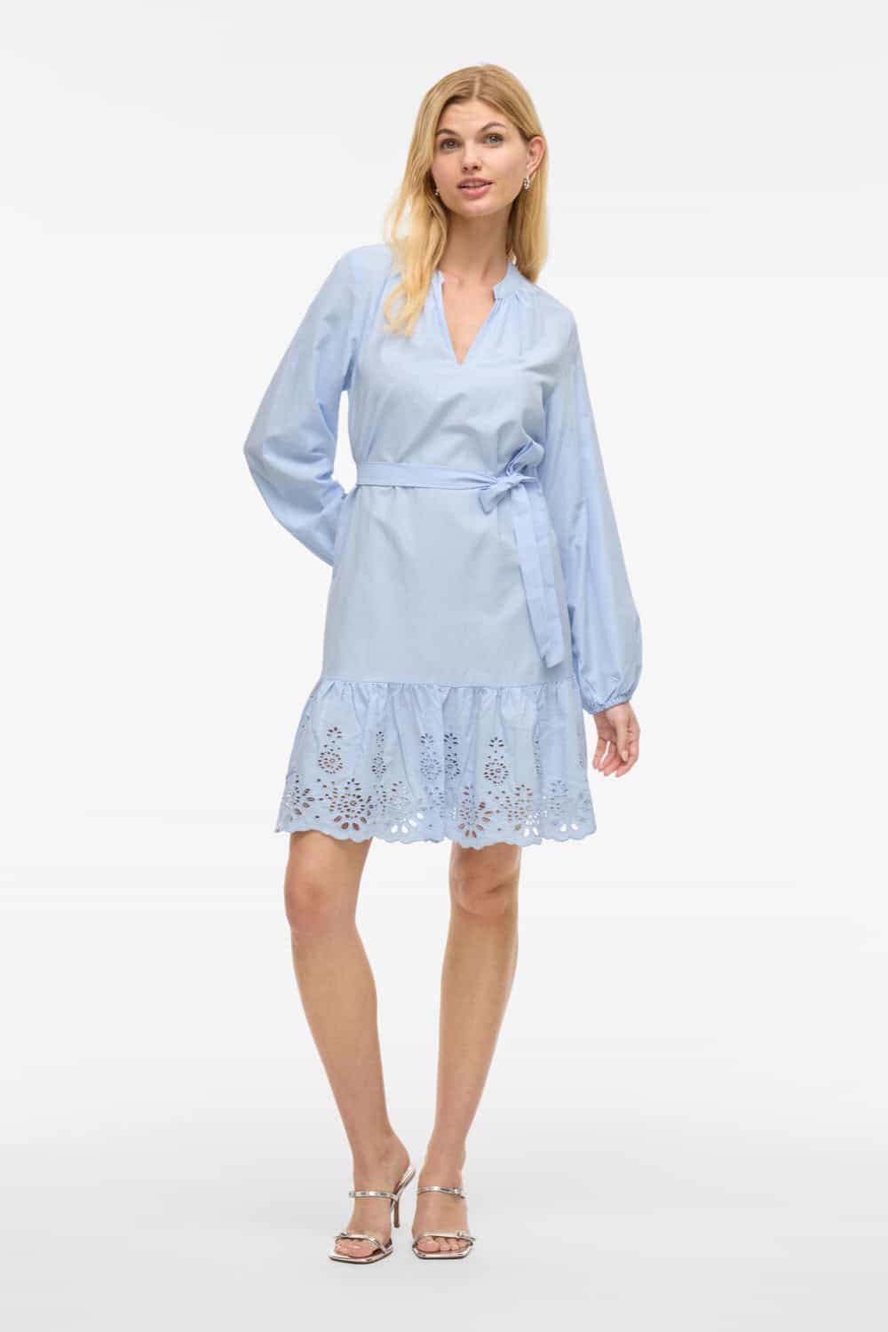 Denne vare udgår af sortiment og sælges til udsolgt. Vikelli kjolen fra Vila er en kort kjole med i en smuk, lyseblå nuance. Kjolen har lange ballonærmer med elastik ved håndleddene, en v-udskæring og bindebånd i taljen, som fremhæver figuren. Den afslut