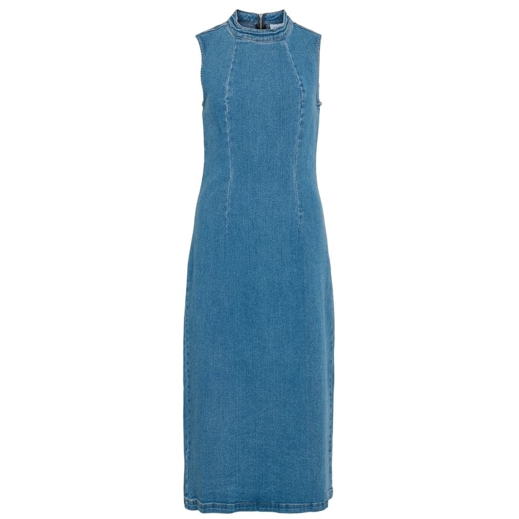 Sejeste denimkjole med de fedeste detaljer fra Vila. Kjolen har et fint slids og lynlås bagpå ryggen, og er ideel til en festlig anledning med et par slingback stiletter. – Trendy- Slids- LynlåsMateriale: 79% Bomuld, 20% Bomuld – Recycled, 1% Elastan