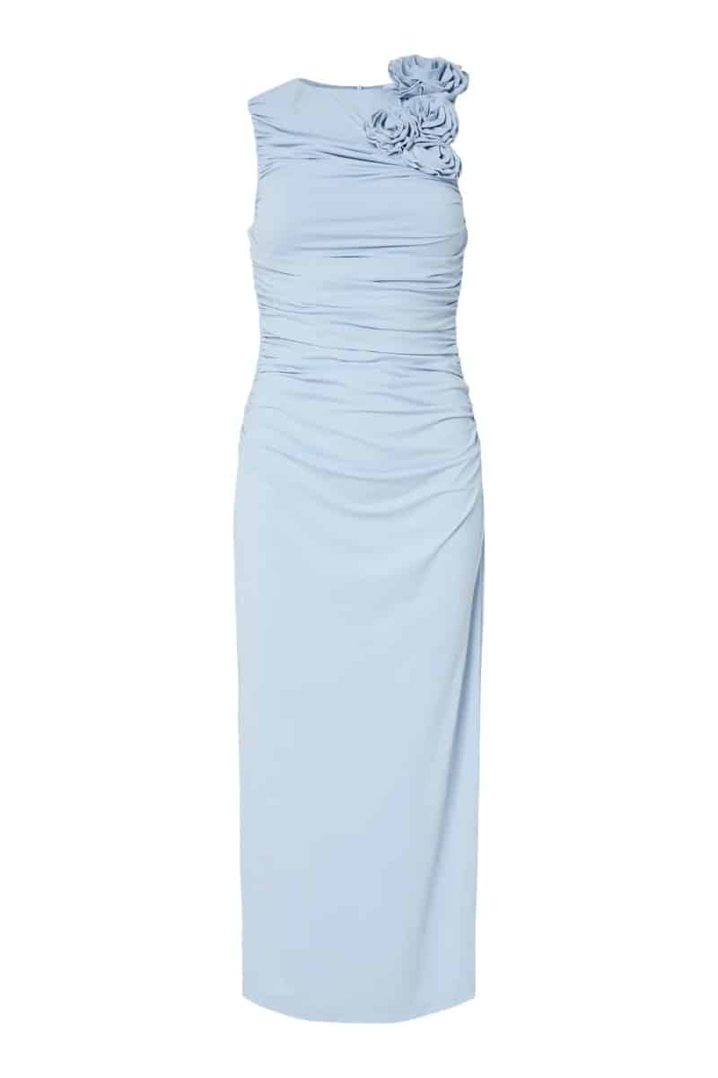 Super elegant lang stram kjole fra Y.A.S. Kjolen er i en smuk lys blå farve og har en fin detalje med roser på den ene skulder. Bag på har kjolen en lynlås i nakken, et slids forneden og en sygning ned langs ryggen som giver flotte detaljer. Perfekt til e