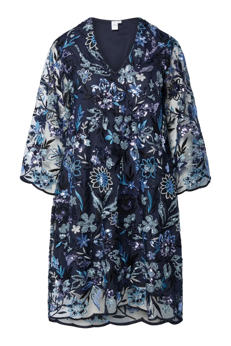 Kjole fra Y.A.S. Denne kjole har en behagelig og rummelig pasform. Kjolen er designet med blomster af pailetter i blå farvenuancer. Kjolen har v-udskæring og er foret.Â