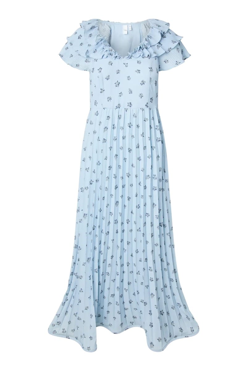 Feminin og romantisk kjole i en smuk lyseblå nuance med et fint, diskret blomsterprint. Kjolen har et let og elegant udtryk, der gør den perfekt til både hverdag og særlige anledninger. Den er designet med en flot flæsedetalje ved udskæringen, som fortsæt